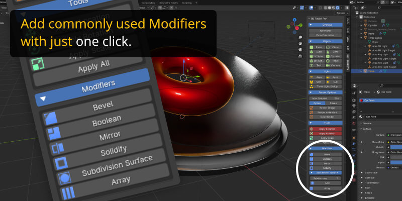 - Add commonly used Modifiers with better defaults: Bevel, Boolean, Mirror, Solidify Subdivision Surface
